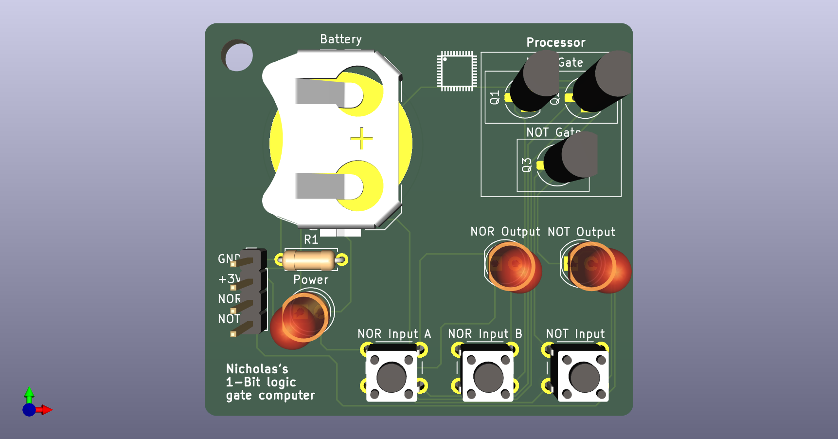 A 1-bit computer that uses NOR and NOT gates as its processor, Push buttons as input, and LEDs as output.
